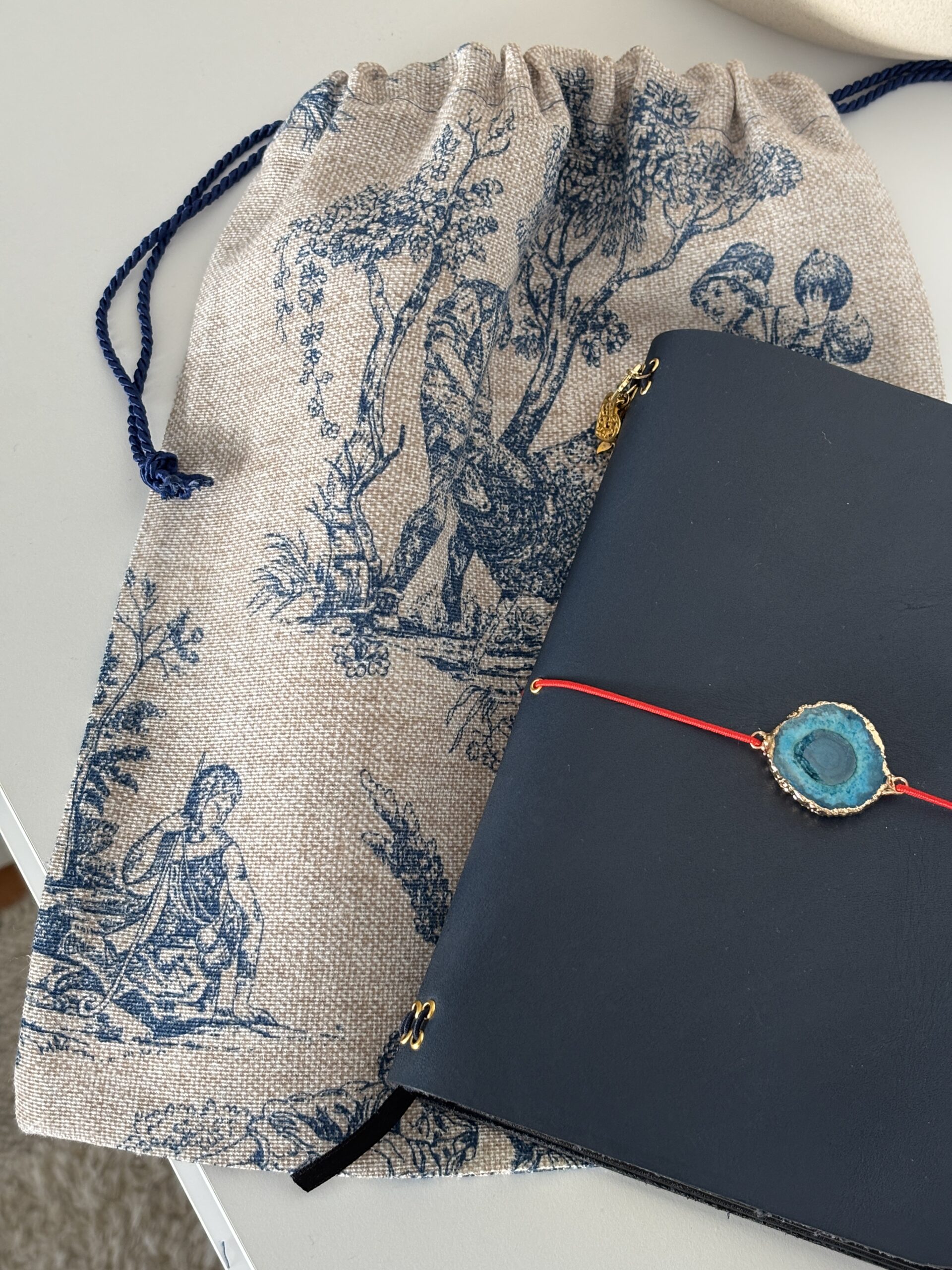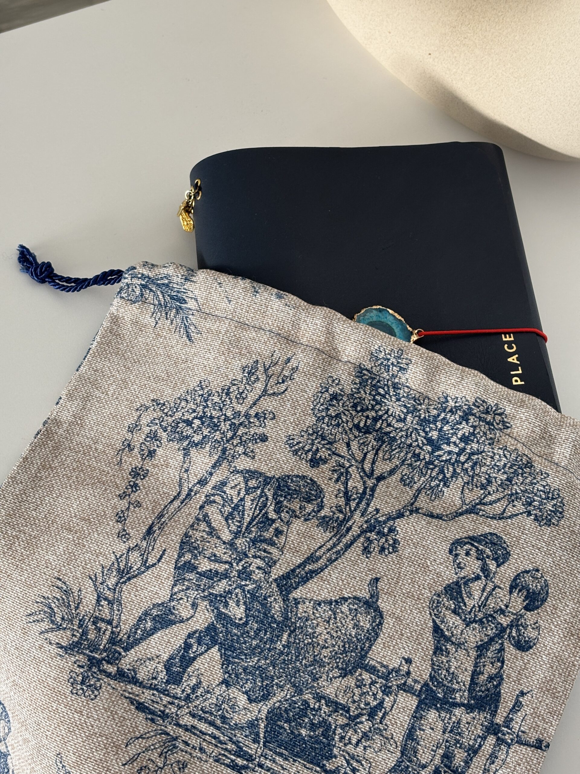 Cuenta con cierre de doble cordón azul marino, resistente y fácil de ajustar, que protege el interior y aporta un bonito contraste con el tejido. Ideal para guardar y proteger journals, libretas, accesorios o pequeños objetos especiales.